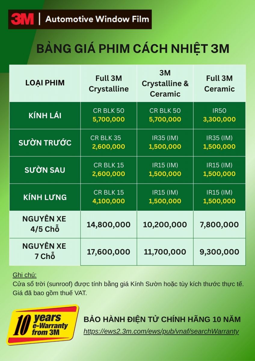 Giá phim cách nhiệt 3M có sự chênh lệch tùy thuộc vào loại phim (cấp phim), vị trí dán hay dòng xe (lớn hay nhỏ)... Tuy nhiên, trung bình, giá phim cách nhiệt 3M dán nguyên xe dao động trong khoảng từ 7.000.000đ/xe đến 17.000.000đ/xe.