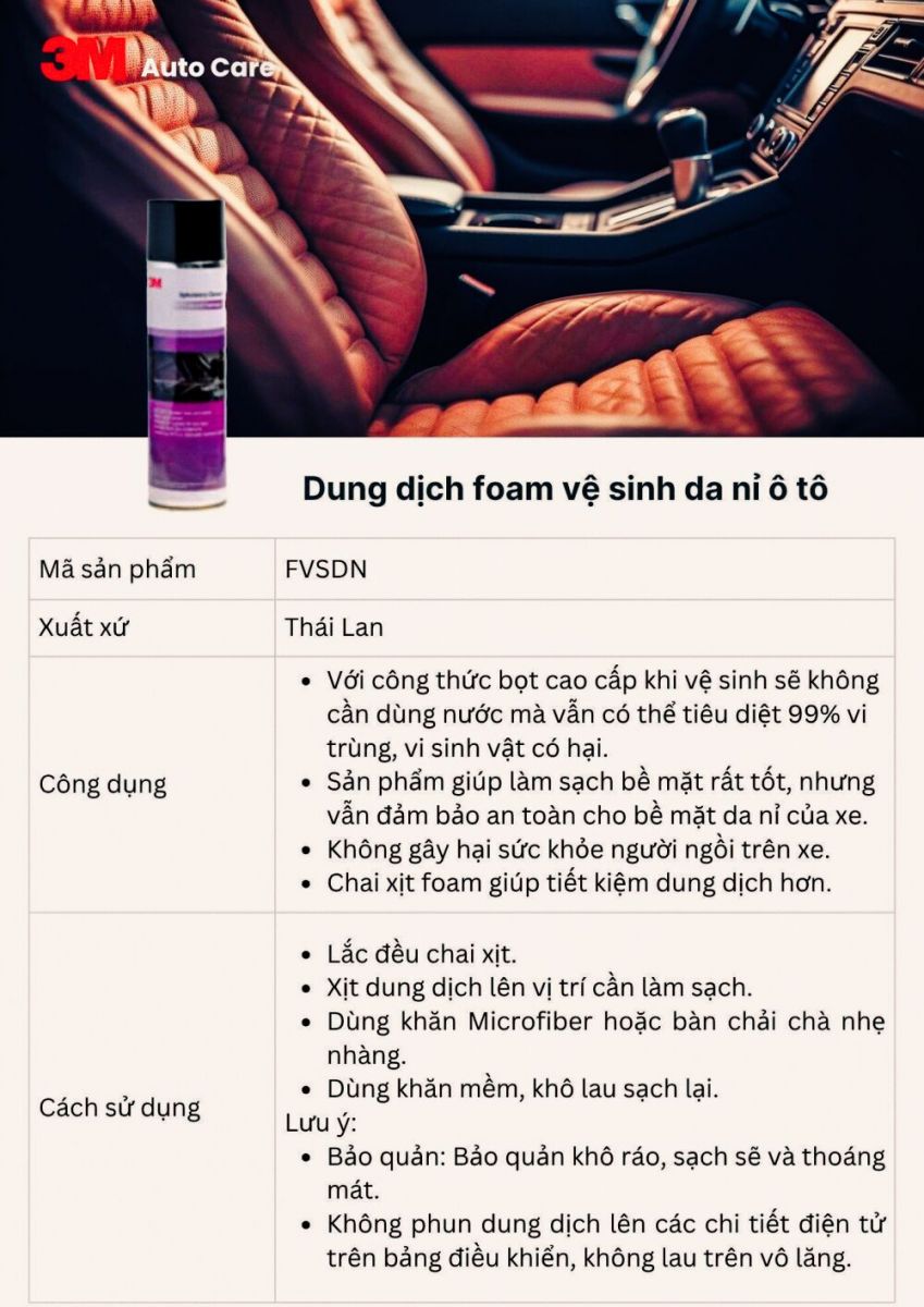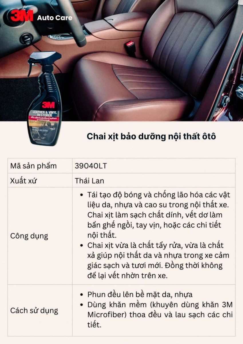Sản phẩm vệ sinh và bảo dưỡng nội thất 3M xử lý hiệu quả các vết bẩn trên bề mặt da, simili, các chi tiết nhựa nội thất như tapi cửa, taplo...